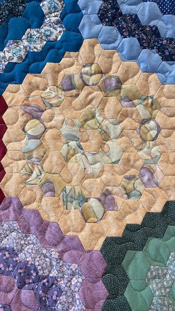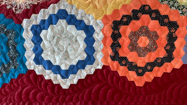 It’s a very beautiful made hexi quilt with large borders on sides and smaller on the top which I quilted with feathers.